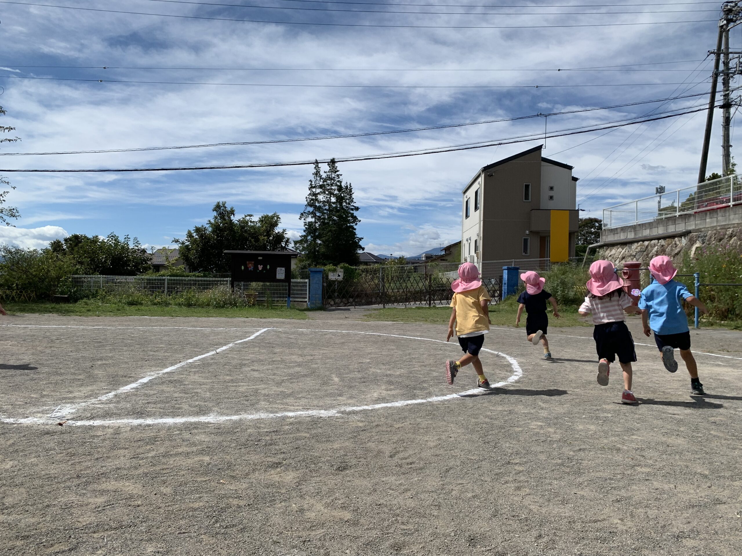 運動会のトラックが園庭にできあがると、進んでかけっこを始めていた子どもたち。