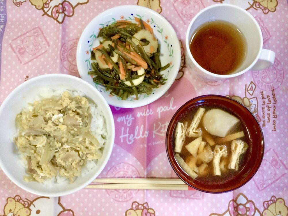 12月1日のきゅうしょく Posted 2025年12月1日 by 松本中央幼稚園 ・ごぼうの卵とじ丼 ・麦茶 ・里芋と油揚げの味噌汁 ・茎ワカメの炒め煮 ↑↑↑年中さんの盛り付け例です😊 年少さんは🥄スプーンを使用しました🥄