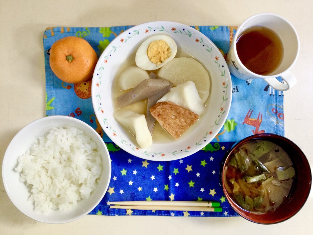 1月26日のきゅうしょく Posted 2026年1月26日 by 松本中央幼稚園 ・ごはん ・麦茶 ・玉ねぎと小松菜の味噌汁 ・たまご入りおでん ・みかん おでんの具は、だいこん・こんにゃく(りすさんはしらたき)・さつまあげ・はんぺん・たまごでした😊